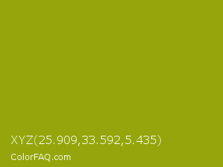XYZ 25.909,33.592,5.435 Color is a normal yellow color and the nearest color is Apple Green #8db600. Hex code #94a60b and RGB value is rgb(148,166,11). In RGB color space, this color is composed of 58% red, 65% green, 4% blue, In CMYK color space, this color is composed of 11% cyan, 0% magenta, 93% yellow , 35% black , In HSL color space, this color has a hue angle of 67° , 88% saturation and 35% lightness.