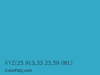 XYZ 25.913,33.23,59.081 Color is a normal cyan color and the nearest color is Pelorous #3eabbf. Hex code #34a9c7 and RGB value is rgb(52,169,199). In RGB color space, this color is composed of 20% red, 66% green, 78% blue, In CMYK color space, this color is composed of 74% cyan, 15% magenta, 0% yellow , 22% black , In HSL color space, this color has a hue angle of 192° , 59% saturation and 49% lightness.