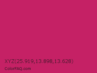 XYZ 25.919,13.898,13.628 Color is a normal rose color and the nearest color is Rose Red #c21e56. Hex code #c52165 and RGB value is rgb(197,33,101). In RGB color space, this color is composed of 77% red, 13% green, 40% blue, In CMYK color space, this color is composed of 0% cyan, 83% magenta, 49% yellow , 23% black , In HSL color space, this color has a hue angle of 335° , 71% saturation and 45% lightness.