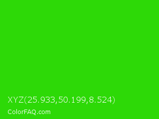 XYZ 25.933,50.199,8.524 Color is a normal green color and the nearest color is Harlequin Green #46cb18. Hex code #2dd907 and RGB value is rgb(45,217,7). In RGB color space, this color is composed of 18% red, 85% green, 3% blue, In CMYK color space, this color is composed of 79% cyan, 0% magenta, 97% yellow , 15% black , In HSL color space, this color has a hue angle of 109° , 94% saturation and 44% lightness.
