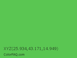 XYZ 25.934,43.171,14.949 Color is a normal green color and the nearest color is Fern #63b76c. Hex code #5ac652 and RGB value is rgb(90,198,82). In RGB color space, this color is composed of 35% red, 78% green, 32% blue, In CMYK color space, this color is composed of 55% cyan, 0% magenta, 59% yellow , 22% black , In HSL color space, this color has a hue angle of 116° , 50% saturation and 55% lightness.