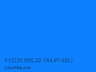 XYZ 25.935,22.744,97.631 Color is a normal blue color and the nearest color is Azure Radiance #007fff. Hex code #0d80ff and RGB value is rgb(13,128,255). In RGB color space, this color is composed of 5% red, 50% green, 100% blue, In CMYK color space, this color is composed of 95% cyan, 50% magenta, 0% yellow , 0% black , In HSL color space, this color has a hue angle of 211° , 100% saturation and 53% lightness.
