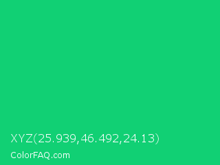 XYZ 25.939,46.492,24.13 Color is a normal green color and the nearest color is Mountain Meadow Crayola #1ab385. Hex code #11d074 and RGB value is rgb(17,208,116). In RGB color space, this color is composed of 7% red, 82% green, 45% blue, In CMYK color space, this color is composed of 92% cyan, 0% magenta, 44% yellow , 18% black , In HSL color space, this color has a hue angle of 151° , 85% saturation and 44% lightness.
