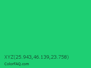 XYZ 25.943,46.139,23.758 Color is a normal green color and the nearest color is UFO Green #3cd070. Hex code #1ecf73 and RGB value is rgb(30,207,115). In RGB color space, this color is composed of 12% red, 81% green, 45% blue, In CMYK color space, this color is composed of 86% cyan, 0% magenta, 44% yellow , 19% black , In HSL color space, this color has a hue angle of 149° , 75% saturation and 46% lightness.