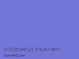 XYZ 25.947,21.576,67.087 Color is a light blue color and the nearest color is Moody Blue #7f76d3. Hex code #7476d7 and RGB value is rgb(116,118,215). In RGB color space, this color is composed of 45% red, 46% green, 84% blue, In CMYK color space, this color is composed of 46% cyan, 45% magenta, 0% yellow , 16% black , In HSL color space, this color has a hue angle of 239° , 55% saturation and 65% lightness.