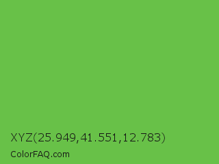 XYZ 25.949,41.551,12.783 Color is a normal green color and the nearest color is Green RYB #66b032. Hex code #68c148 and RGB value is rgb(104,193,72). In RGB color space, this color is composed of 41% red, 76% green, 28% blue, In CMYK color space, this color is composed of 46% cyan, 0% magenta, 63% yellow , 24% black , In HSL color space, this color has a hue angle of 104° , 49% saturation and 52% lightness.