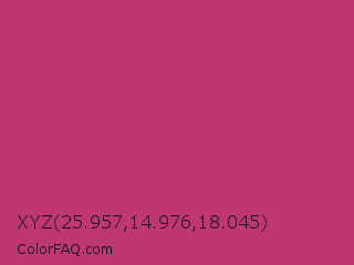 XYZ 25.957,14.976,18.045 Color is a normal rose color and the nearest color is Hibiscus #b6316c. Hex code #bf3674 and RGB value is rgb(191,54,116). In RGB color space, this color is composed of 75% red, 21% green, 45% blue, In CMYK color space, this color is composed of 0% cyan, 72% magenta, 39% yellow , 25% black , In HSL color space, this color has a hue angle of 333° , 56% saturation and 48% lightness.
