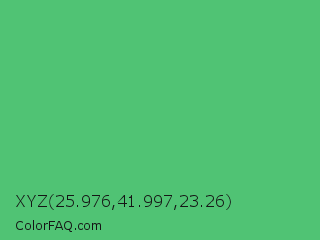 XYZ 25.976,41.997,23.26 Color is a normal green color and the nearest color is Emerald #50c878. Hex code #50c374 and RGB value is rgb(80,195,116). In RGB color space, this color is composed of 31% red, 76% green, 45% blue, In CMYK color space, this color is composed of 59% cyan, 0% magenta, 41% yellow , 24% black , In HSL color space, this color has a hue angle of 139° , 49% saturation and 54% lightness.