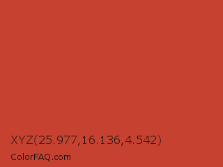 XYZ 25.977,16.136,4.542 Color is a normal red color and the nearest color is Mojo #c04737. Hex code #c74130 and RGB value is rgb(199,65,48). In RGB color space, this color is composed of 78% red, 25% green, 19% blue, In CMYK color space, this color is composed of 0% cyan, 67% magenta, 76% yellow , 22% black , In HSL color space, this color has a hue angle of 7° , 61% saturation and 48% lightness.