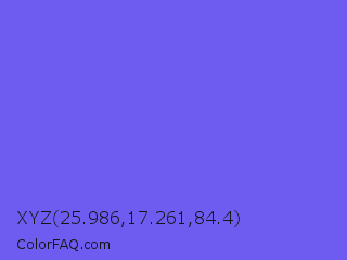 XYZ 25.986,17.261,84.4 Color is a light indigo color and the nearest color is Medium Slate Blue #7b68ee. Hex code #6e5cf0 and RGB value is rgb(110,92,240). In RGB color space, this color is composed of 43% red, 36% green, 94% blue, In CMYK color space, this color is composed of 54% cyan, 62% magenta, 0% yellow , 6% black , In HSL color space, this color has a hue angle of 247° , 83% saturation and 65% lightness.