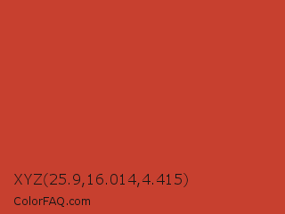 XYZ 25.9,16.014,4.415 Color is a normal red color and the nearest color is International Orange Golden Gate Bridge #c0362c. Hex code #c7402f and RGB value is rgb(199,64,47). In RGB color space, this color is composed of 78% red, 25% green, 18% blue, In CMYK color space, this color is composed of 0% cyan, 68% magenta, 76% yellow , 22% black , In HSL color space, this color has a hue angle of 7° , 62% saturation and 48% lightness.