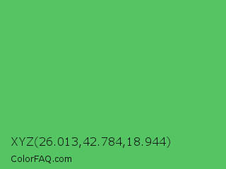 XYZ 26.013,42.784,18.944 Color is a normal green color and the nearest color is Emerald #50c878. Hex code #55c564 and RGB value is rgb(85,197,100). In RGB color space, this color is composed of 33% red, 77% green, 39% blue, In CMYK color space, this color is composed of 57% cyan, 0% magenta, 49% yellow , 23% black , In HSL color space, this color has a hue angle of 128° , 49% saturation and 55% lightness.
