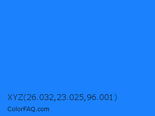 XYZ 26.032,23.025,96.001 Color is a normal blue color and the nearest color is Blue Crayola #1f75fe. Hex code #1b81fd and RGB value is rgb(27,129,253). In RGB color space, this color is composed of 11% red, 51% green, 99% blue, In CMYK color space, this color is composed of 89% cyan, 49% magenta, 0% yellow , 1% black , In HSL color space, this color has a hue angle of 213° , 98% saturation and 55% lightness.
