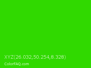 XYZ 26.032,50.254,8.328 Color is a normal green color and the nearest color is Harlequin Green #46cb18. Hex code #30d900 and RGB value is rgb(48,217,0). In RGB color space, this color is composed of 19% red, 85% green, 0% blue, In CMYK color space, this color is composed of 78% cyan, 0% magenta, 100% yellow , 15% black , In HSL color space, this color has a hue angle of 107° , 100% saturation and 43% lightness.