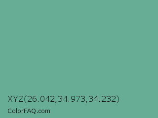 XYZ 26.042,34.973,34.232 Color is a normal green color and the nearest color is Silver Tree #66b58f. Hex code #67ad96 and RGB value is rgb(103,173,150). In RGB color space, this color is composed of 40% red, 68% green, 59% blue, In CMYK color space, this color is composed of 40% cyan, 0% magenta, 13% yellow , 32% black , In HSL color space, this color has a hue angle of 160° , 30% saturation and 54% lightness.