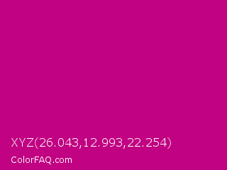 XYZ 26.043,12.993,22.254 Color is a normal magenta color and the nearest color is Red Violet #c71585. Hex code #c10282 and RGB value is rgb(193,2,130). In RGB color space, this color is composed of 76% red, 1% green, 51% blue, In CMYK color space, this color is composed of 0% cyan, 99% magenta, 33% yellow , 24% black , In HSL color space, this color has a hue angle of 320° , 98% saturation and 38% lightness.