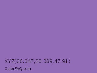 XYZ 26.047,20.389,47.91 Color is a normal purple color and the nearest color is Wisteria #9771b5. Hex code #936cb8 and RGB value is rgb(147,108,184). In RGB color space, this color is composed of 58% red, 42% green, 72% blue, In CMYK color space, this color is composed of 20% cyan, 41% magenta, 0% yellow , 28% black , In HSL color space, this color has a hue angle of 271° , 35% saturation and 57% lightness.