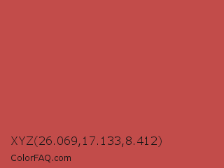 XYZ 26.069,17.133,8.412 Color is a normal red color and the nearest color is Bittersweet Shimmer #bf4f51. Hex code #c24c4a and RGB value is rgb(194,76,74). In RGB color space, this color is composed of 76% red, 30% green, 29% blue, In CMYK color space, this color is composed of 0% cyan, 61% magenta, 62% yellow , 24% black , In HSL color space, this color has a hue angle of 1° , 50% saturation and 53% lightness.