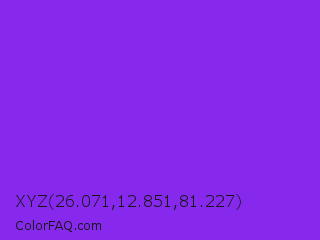 XYZ 26.071,12.851,81.227 Color is a normal violet color and the nearest color is Blue Violet #8a2be2. Hex code #8729ed and RGB value is rgb(135,41,237). In RGB color space, this color is composed of 53% red, 16% green, 93% blue, In CMYK color space, this color is composed of 43% cyan, 83% magenta, 0% yellow , 7% black , In HSL color space, this color has a hue angle of 269° , 84% saturation and 55% lightness.