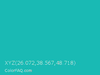 XYZ 26.072,38.567,48.718 Color is a normal cyan color and the nearest color is Tiffany Blue #0abab5. Hex code #18bab3 and RGB value is rgb(24,186,179). In RGB color space, this color is composed of 9% red, 73% green, 70% blue, In CMYK color space, this color is composed of 87% cyan, 0% magenta, 4% yellow , 27% black , In HSL color space, this color has a hue angle of 177° , 77% saturation and 41% lightness.