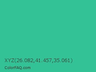 XYZ 26.082,41.457,35.061 Color is a normal green color and the nearest color is Mountain Meadow #30ba8f. Hex code #33c295 and RGB value is rgb(51,194,149). In RGB color space, this color is composed of 20% red, 76% green, 58% blue, In CMYK color space, this color is composed of 74% cyan, 0% magenta, 23% yellow , 24% black , In HSL color space, this color has a hue angle of 161° , 58% saturation and 48% lightness.