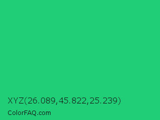 XYZ 26.089,45.822,25.239 Color is a normal green color and the nearest color is UFO Green #3cd070. Hex code #21ce78 and RGB value is rgb(33,206,120). In RGB color space, this color is composed of 13% red, 81% green, 47% blue, In CMYK color space, this color is composed of 84% cyan, 0% magenta, 42% yellow , 19% black , In HSL color space, this color has a hue angle of 150° , 72% saturation and 47% lightness.