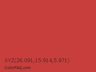 XYZ 26.091,15.914,5.971 Color is a normal red color and the nearest color is Mojo #c04737. Hex code #c73e3c and RGB value is rgb(199,62,60). In RGB color space, this color is composed of 78% red, 24% green, 24% blue, In CMYK color space, this color is composed of 0% cyan, 69% magenta, 70% yellow , 22% black , In HSL color space, this color has a hue angle of 1° , 55% saturation and 51% lightness.