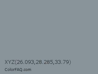 XYZ 26.093,28.285,33.79 Color is a normal blue color and the nearest color is Regent Gray #86949f. Hex code #879398 and RGB value is rgb(135,147,152). In RGB color space, this color is composed of 53% red, 58% green, 60% blue, In CMYK color space, this color is composed of 11% cyan, 3% magenta, 0% yellow , 40% black , In HSL color space, this color has a hue angle of 198° , 8% saturation and 56% lightness.