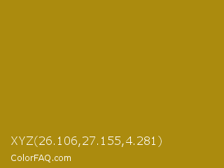 XYZ 26.106,27.155,4.281 Color is a normal yellow color and the nearest color is Dark Goldenrod #b8860b. Hex code #ab8b0e and RGB value is rgb(171,139,14). In RGB color space, this color is composed of 67% red, 55% green, 5% blue, In CMYK color space, this color is composed of 0% cyan, 19% magenta, 92% yellow , 33% black , In HSL color space, this color has a hue angle of 48° , 85% saturation and 36% lightness.