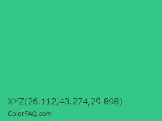 XYZ 26.112,43.274,29.898 Color is a normal green color and the nearest color is Mountain Meadow #30ba8f. Hex code #32c787 and RGB value is rgb(50,199,135). In RGB color space, this color is composed of 20% red, 78% green, 53% blue, In CMYK color space, this color is composed of 75% cyan, 0% magenta, 32% yellow , 22% black , In HSL color space, this color has a hue angle of 154° , 60% saturation and 49% lightness.