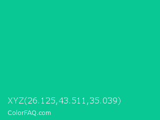 XYZ 26.125,43.511,35.039 Color is a normal cyan color and the nearest color is Caribbean Green #00cc99. Hex code #0ac894 and RGB value is rgb(10,200,148). In RGB color space, this color is composed of 4% red, 78% green, 58% blue, In CMYK color space, this color is composed of 95% cyan, 0% magenta, 26% yellow , 22% black , In HSL color space, this color has a hue angle of 164° , 90% saturation and 41% lightness.