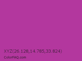 XYZ 26.128,14.785,33.824 Color is a normal magenta color and the nearest color is Byzantine #bd33a4. Hex code #b3379e and RGB value is rgb(179,55,158). In RGB color space, this color is composed of 70% red, 22% green, 62% blue, In CMYK color space, this color is composed of 0% cyan, 69% magenta, 12% yellow , 30% black , In HSL color space, this color has a hue angle of 310° , 53% saturation and 46% lightness.