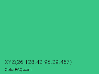 XYZ 26.128,42.95,29.467 Color is a normal green color and the nearest color is Mountain Meadow #30ba8f. Hex code #38c686 and RGB value is rgb(56,198,134). In RGB color space, this color is composed of 22% red, 78% green, 53% blue, In CMYK color space, this color is composed of 72% cyan, 0% magenta, 32% yellow , 22% black , In HSL color space, this color has a hue angle of 153° , 56% saturation and 50% lightness.