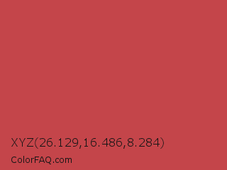 XYZ 26.129,16.486,8.284 Color is a normal red color and the nearest color is English Vermillion #cc474b. Hex code #c4454a and RGB value is rgb(196,69,74). In RGB color space, this color is composed of 77% red, 27% green, 29% blue, In CMYK color space, this color is composed of 0% cyan, 65% magenta, 62% yellow , 23% black , In HSL color space, this color has a hue angle of 358° , 52% saturation and 52% lightness.