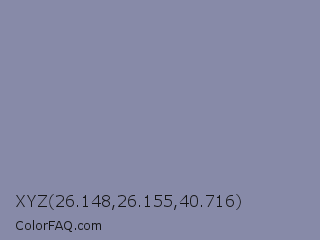 XYZ 26.148,26.155,40.716 Color is a normal blue color and the nearest color is Cool Grey #8c92ac. Hex code #878aa8 and RGB value is rgb(135,138,168). In RGB color space, this color is composed of 53% red, 54% green, 66% blue, In CMYK color space, this color is composed of 20% cyan, 18% magenta, 0% yellow , 34% black , In HSL color space, this color has a hue angle of 235° , 16% saturation and 59% lightness.