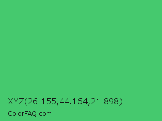 XYZ 26.155,44.164,21.898 Color is a normal green color and the nearest color is UFO Green #3cd070. Hex code #45c96e and RGB value is rgb(69,201,110). In RGB color space, this color is composed of 27% red, 79% green, 43% blue, In CMYK color space, this color is composed of 66% cyan, 0% magenta, 45% yellow , 21% black , In HSL color space, this color has a hue angle of 139° , 55% saturation and 53% lightness.