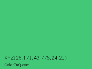 XYZ 26.171,43.775,24.21 Color is a normal green color and the nearest color is UFO Green #3cd070. Hex code #42c876 and RGB value is rgb(66,200,118). In RGB color space, this color is composed of 26% red, 78% green, 46% blue, In CMYK color space, this color is composed of 67% cyan, 0% magenta, 41% yellow , 22% black , In HSL color space, this color has a hue angle of 143° , 55% saturation and 52% lightness.