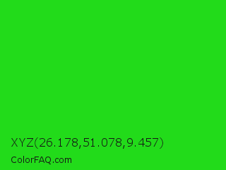 XYZ 26.178,51.078,9.457 Color is a normal green color and the nearest color is Lime Green #32cd32. Hex code #22db1a and RGB value is rgb(34,219,26). In RGB color space, this color is composed of 13% red, 86% green, 10% blue, In CMYK color space, this color is composed of 84% cyan, 0% magenta, 88% yellow , 14% black , In HSL color space, this color has a hue angle of 118° , 79% saturation and 48% lightness.
