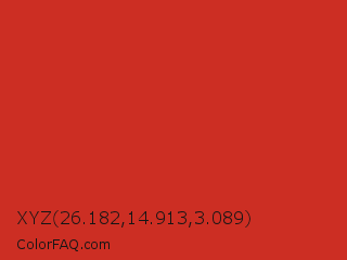 XYZ 26.182,14.913,3.089 Color is a normal red color and the nearest color is Fire Engine Red #ce2029. Hex code #cc2e23 and RGB value is rgb(204,46,35). In RGB color space, this color is composed of 80% red, 18% green, 14% blue, In CMYK color space, this color is composed of 0% cyan, 77% magenta, 83% yellow , 20% black , In HSL color space, this color has a hue angle of 4° , 71% saturation and 47% lightness.