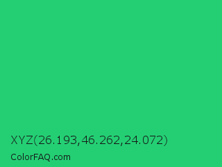 XYZ 26.193,46.262,24.072 Color is a normal green color and the nearest color is UFO Green #3cd070. Hex code #24cf74 and RGB value is rgb(36,207,116). In RGB color space, this color is composed of 14% red, 81% green, 45% blue, In CMYK color space, this color is composed of 83% cyan, 0% magenta, 44% yellow , 19% black , In HSL color space, this color has a hue angle of 148° , 70% saturation and 48% lightness.