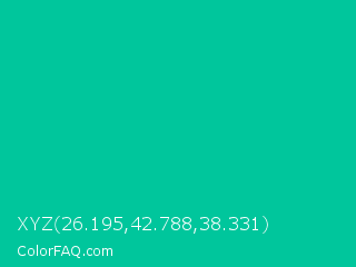 XYZ 26.195,42.788,38.331 Color is a normal cyan color and the nearest color is Caribbean Green #00cc99. Hex code #00c69c and RGB value is rgb(0,198,156). In RGB color space, this color is composed of 0% red, 78% green, 61% blue, In CMYK color space, this color is composed of 100% cyan, 0% magenta, 21% yellow , 22% black , In HSL color space, this color has a hue angle of 167° , 100% saturation and 39% lightness.