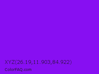XYZ 26.19,11.903,84.922 Color is a normal purple color and the nearest color is Electric Violet #8b00ff. Hex code #870ff2 and RGB value is rgb(135,15,242). In RGB color space, this color is composed of 53% red, 6% green, 95% blue, In CMYK color space, this color is composed of 44% cyan, 94% magenta, 0% yellow , 5% black , In HSL color space, this color has a hue angle of 272° , 90% saturation and 50% lightness.