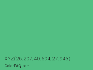 XYZ 26.207,40.694,27.946 Color is a normal green color and the nearest color is Emerald #50c878. Hex code #52bf83 and RGB value is rgb(82,191,131). In RGB color space, this color is composed of 32% red, 75% green, 51% blue, In CMYK color space, this color is composed of 57% cyan, 0% magenta, 31% yellow , 25% black , In HSL color space, this color has a hue angle of 147° , 46% saturation and 54% lightness.