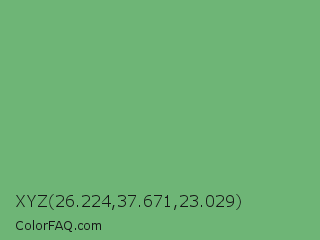 XYZ 26.224,37.671,23.029 Color is a normal green color and the nearest color is Iguana Green #71bc78. Hex code #6eb576 and RGB value is rgb(110,181,118). In RGB color space, this color is composed of 43% red, 71% green, 46% blue, In CMYK color space, this color is composed of 39% cyan, 0% magenta, 35% yellow , 29% black , In HSL color space, this color has a hue angle of 127° , 32% saturation and 57% lightness.