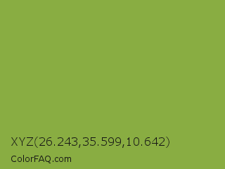 XYZ 26.243,35.599,10.642 Color is a normal green color and the nearest color is Sushi #87ab39. Hex code #89ad42 and RGB value is rgb(137,173,66). In RGB color space, this color is composed of 54% red, 68% green, 26% blue, In CMYK color space, this color is composed of 21% cyan, 0% magenta, 62% yellow , 32% black , In HSL color space, this color has a hue angle of 80° , 45% saturation and 47% lightness.