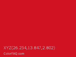 XYZ 26.254,13.847,2.802 Color is a normal red color and the nearest color is Lava #cf1020. Hex code #cf1322 and RGB value is rgb(207,19,34). In RGB color space, this color is composed of 81% red, 7% green, 13% blue, In CMYK color space, this color is composed of 0% cyan, 91% magenta, 84% yellow , 19% black , In HSL color space, this color has a hue angle of 355° , 83% saturation and 44% lightness.