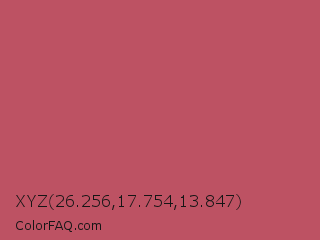 XYZ 26.256,17.754,13.847 Color is a normal red color and the nearest color is Popstar #be4f62. Hex code #bd5263 and RGB value is rgb(189,82,99). In RGB color space, this color is composed of 74% red, 32% green, 39% blue, In CMYK color space, this color is composed of 0% cyan, 57% magenta, 48% yellow , 26% black , In HSL color space, this color has a hue angle of 350° , 45% saturation and 53% lightness.