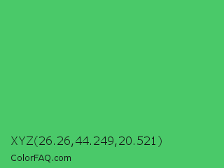 XYZ 26.26,44.249,20.521 Color is a normal green color and the nearest color is Emerald #50c878. Hex code #4ac969 and RGB value is rgb(74,201,105). In RGB color space, this color is composed of 29% red, 79% green, 41% blue, In CMYK color space, this color is composed of 63% cyan, 0% magenta, 48% yellow , 21% black , In HSL color space, this color has a hue angle of 135° , 54% saturation and 54% lightness.