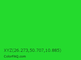 XYZ 26.273,50.707,10.885 Color is a normal green color and the nearest color is Lime Green #32cd32. Hex code #24da2d and RGB value is rgb(36,218,45). In RGB color space, this color is composed of 14% red, 85% green, 18% blue, In CMYK color space, this color is composed of 83% cyan, 0% magenta, 79% yellow , 15% black , In HSL color space, this color has a hue angle of 123° , 72% saturation and 50% lightness.