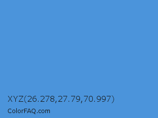 XYZ 26.278,27.79,70.997 Color is a normal blue color and the nearest color is Havelock Blue #5590d9. Hex code #4b94db and RGB value is rgb(75,148,219). In RGB color space, this color is composed of 29% red, 58% green, 86% blue, In CMYK color space, this color is composed of 66% cyan, 32% magenta, 0% yellow , 14% black , In HSL color space, this color has a hue angle of 210° , 67% saturation and 58% lightness.